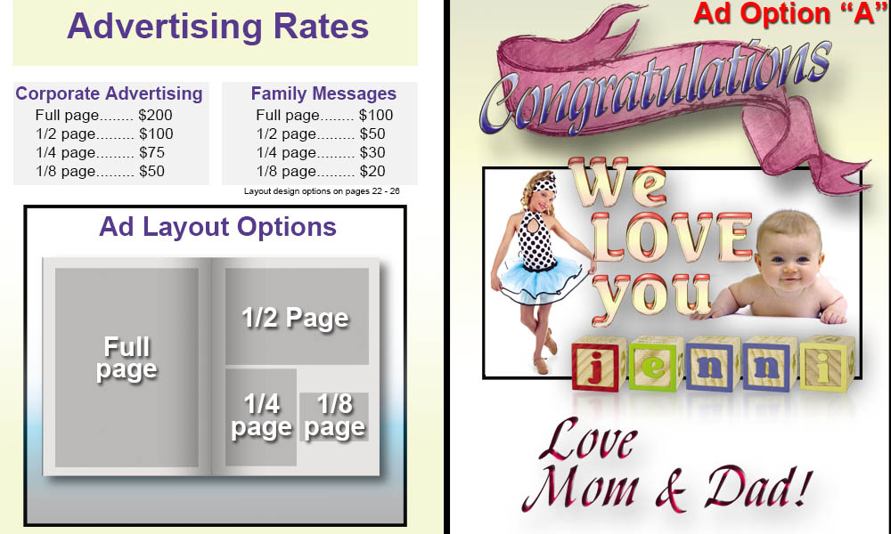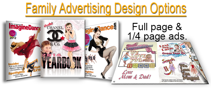 Parent Full Page or 1/4 Page Ad Options "F" & "G" utilize a studio photo from picture day. Customizable options include: -background color preference -Dancer's FIRST name -a short message -an optional "Mom & Dad" text element