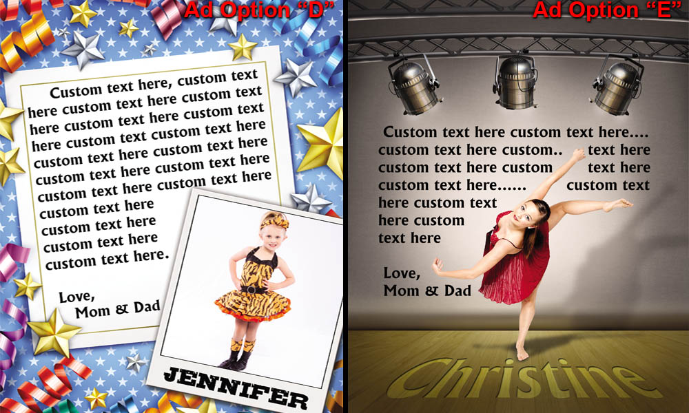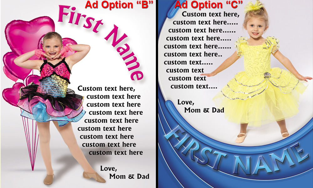 Parent Full Page or 1/4 Page Ad Options "D" & "E" utilize a studio photo from picture day. Customizable options include: -the Dancer's FIRST name -a short message -an optional "Mom & Dad" text element