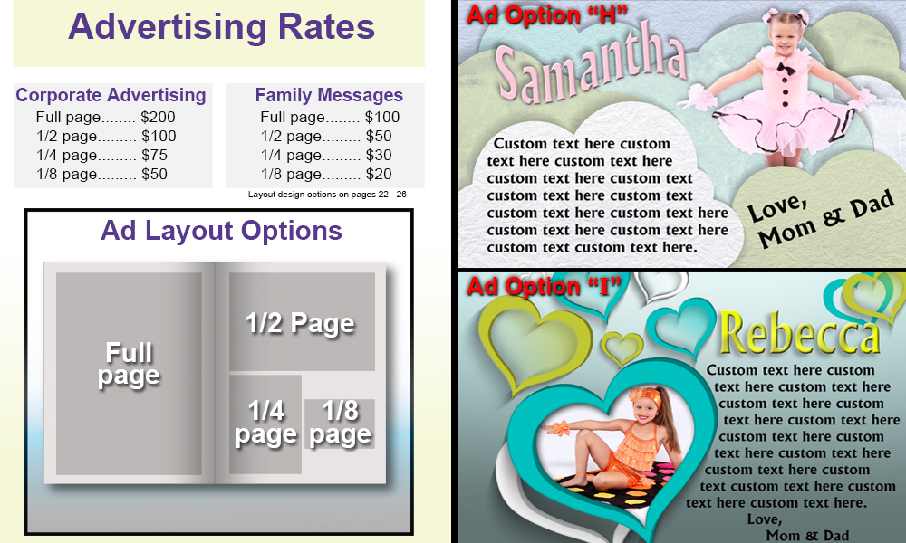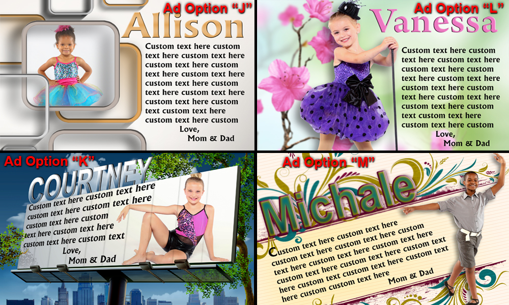 Parent Half Page or 1/8 Page Ad Options "J", "K", "L" & "M" utilize a studio photo from picture day. Customizable options include: -Dancer's FIRST name -a short message -an optional "Mom & Dad" text element